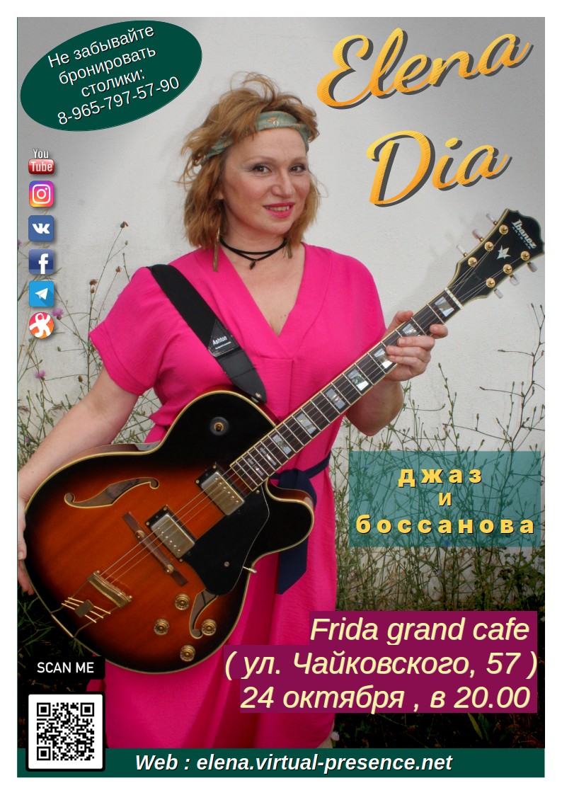 Frida Grand Cafe – Saint Petersburg (Russia) When October 24, 2025 8:00 pm - 11:00 pm Add To Calendar Download ICS Google Calendar iCalendar Office 365 Outlook Live — Elena Dia — Frida grand cafe ( ул. Чайковского, 57 ) – 24 октября , в 20.00 джаз и боссанова Не забывайте бронировать столики: 8-965-797-57-90 Карта доступа : https://maps.app.goo.gl/NAtnq2PaARFdSRRf6 Share this with :